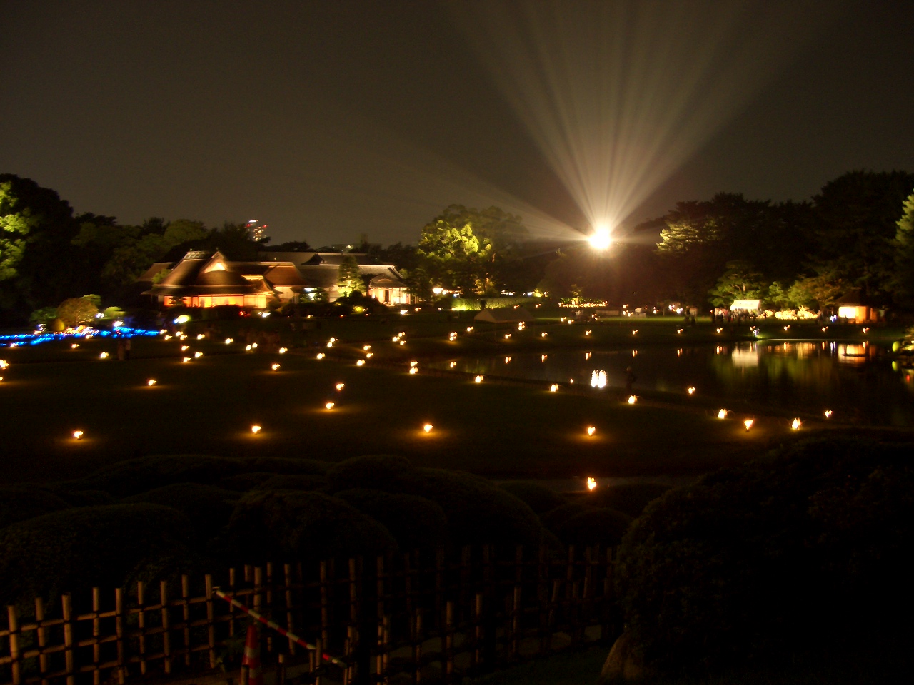 画像は2007年7月29日(日) 点灯式直後、後楽園 沢の池越しに 延養亭 を撮影したもの。