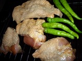 1.鶏の皮に、フォークを使って穴を開け(鶏の皮が焼けて膨らむのを防ぐため)、4等分に切り分けます。