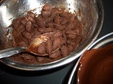 6.刻んだチョコレートをボウルに入れ、60℃の湯せんで溶かし、27℃まで冷まし、34℃まで温度を上げて、テンパリング終了。