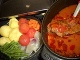 6.鍋(5.)を強火で沸かし、軽くアクを取り、弱火に落としフタをして、5-6時間ほど煮込みます。