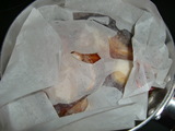 5.正面から見て魚(3.)の頭が左になるよう鍋(4.)に入れ、ショウガ・竹の子・ゴボウ(1.)を入れて、落とし蓋(クッキングシート)をします。