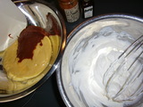 11. カスタードクリーム(9.)に、プラリネクリーム・コアントローを入れてヘラで混ぜ合わせ、ボウル(10.)を加えてかき混ぜ、特製クリームの完成。