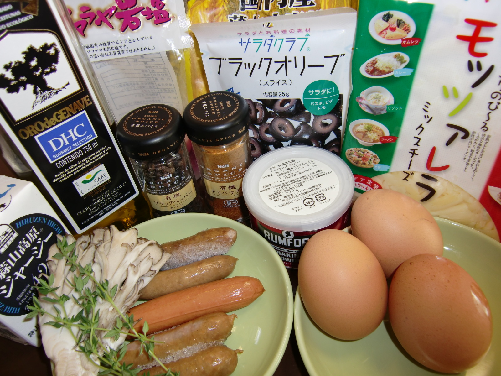 ・薄力粉 200g ・ベーキングパウダー 10g ・卵 3個 ・ソーセージ 80g ・舞茸 1/2株 ・タイム 5枝・ブラックオリーブ(スライス) 25g ・ピザ用チーズ 50g ・牛乳 100cc ・オリーブオイル 100cc ・岩塩 小さじ1/2