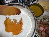 4.ボウルに、薄力粉・ベーキングパウダーを合わせて振るい入れ、中央にくぼみを作って卵液(3.)を注ぎ、粉の土手をくずしながらヘラでかき混ぜます。