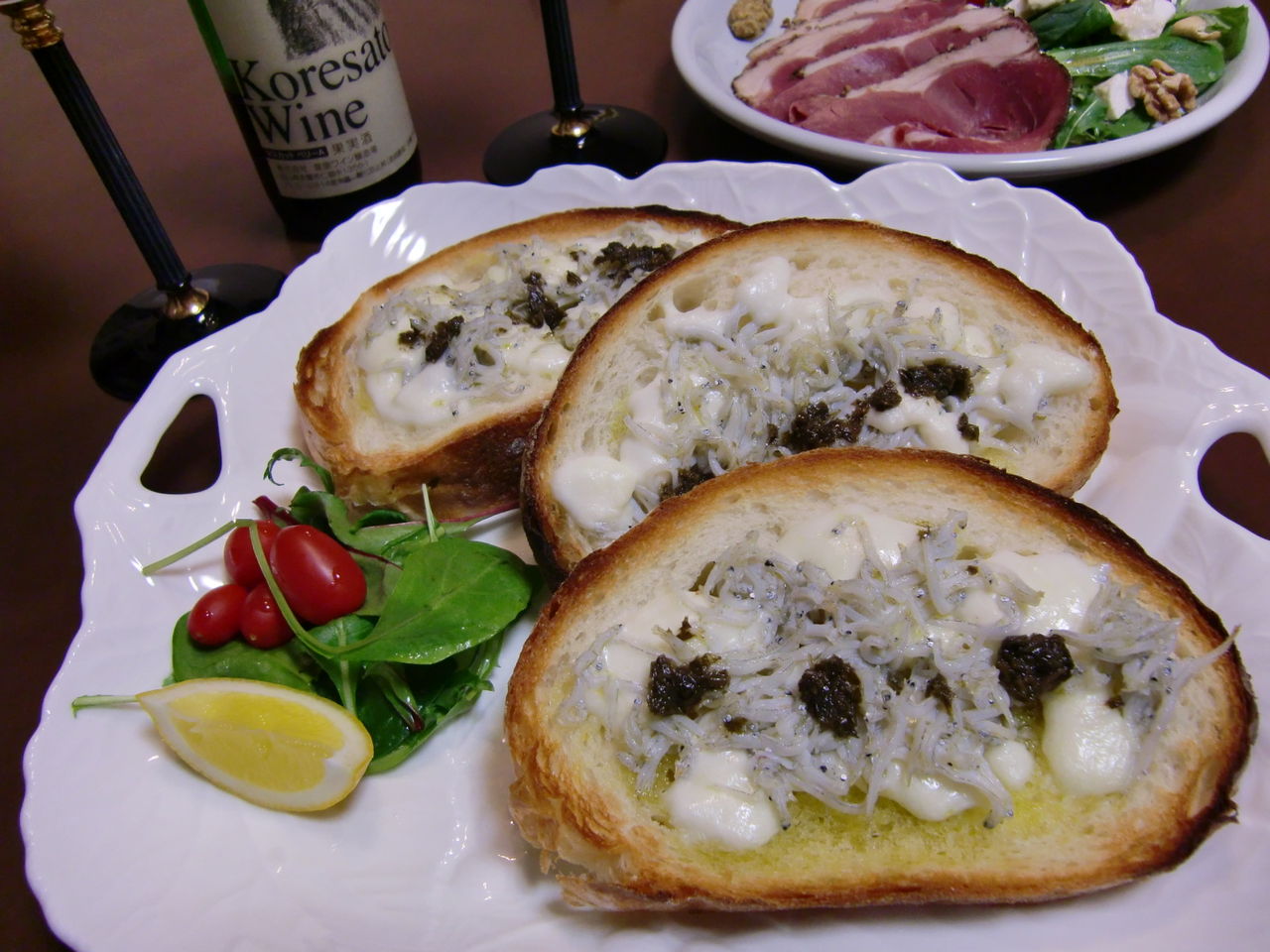 ・カンパーニュ(田舎パン)スライス 3切れ・釜揚げシラス 50g ・モッツァレッラ お好み