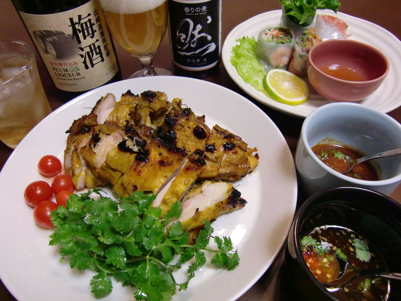 6.鶏肉(3.)をロースターで中に火が通るまで焼き、ひと口大に切って皿に盛りつけ、パクチーの葉と辛口ソース(5.)、市販のスイートチリソース2種類を添えて出来上がり。