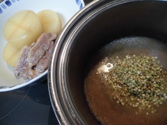 蕎麦の実を煮るとき、水気が足りなくなったら適宜、水を足しながら作ります。鴨肉に熱を入れ過ぎる(煮過ぎる)と硬くなるので、チャチャッと仕上げましょう。