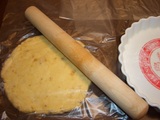 4.タネ(3.)を直径 3cm ほどの棒状に伸ばし、スケイパーで適当に切り、それを丸めて指先で平らにつぶし、団子のカタチに整えます。