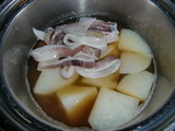 3.フライパン(1.)に塩辛・黒コショウを入れ、イカがカリッとなるまで弱火で炒め、舞茸・酒を入れて軽く炒めます。