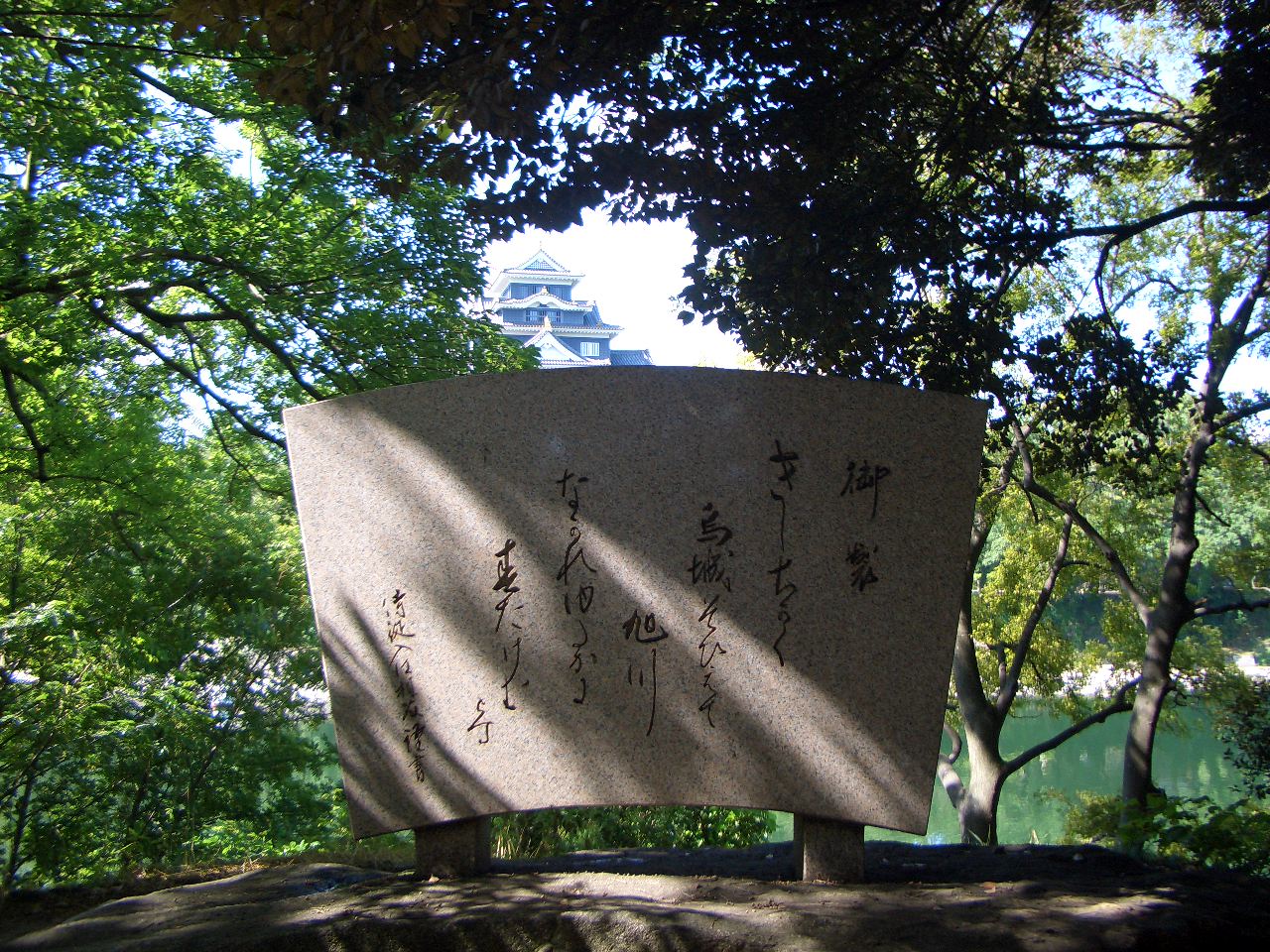 (画像は2008年7月20(日)、岡山後楽園 南門を出て左、まもなくの地点にある御製歌の石碑)